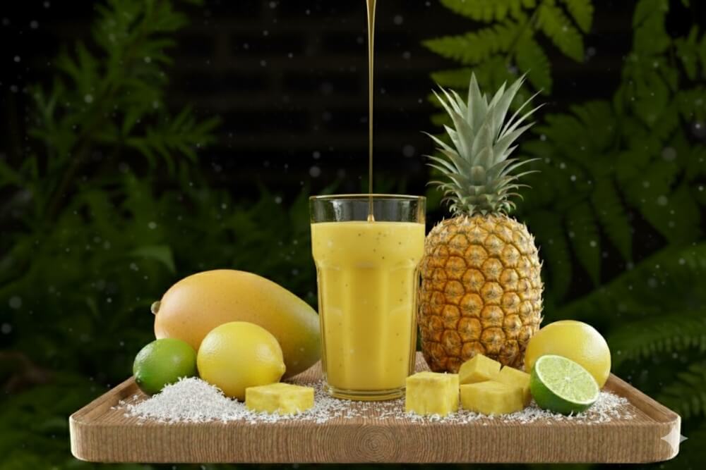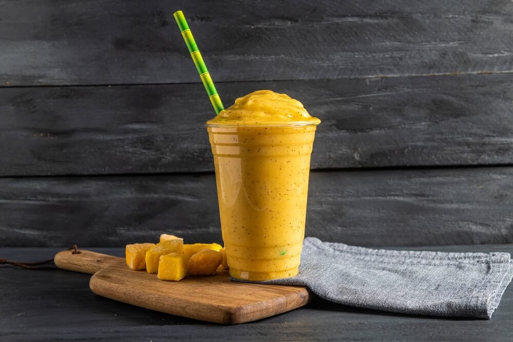 A sunny, beach-in-a-glass zing with a juicy lift. Blended with mango, pineapple, lemon, shredded coconut, and honey.