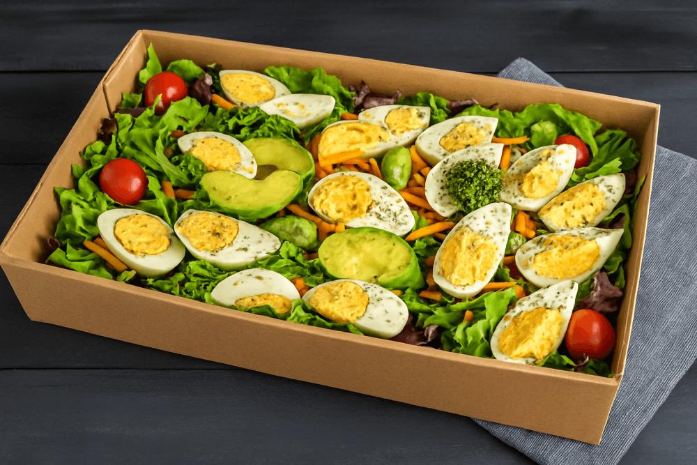 Egg Salad Catering Box – fresh boiled eggs, avocado, greens, and veggies in a brown carton tray, crafted to serve 6–8 people with flavor and nutrition.