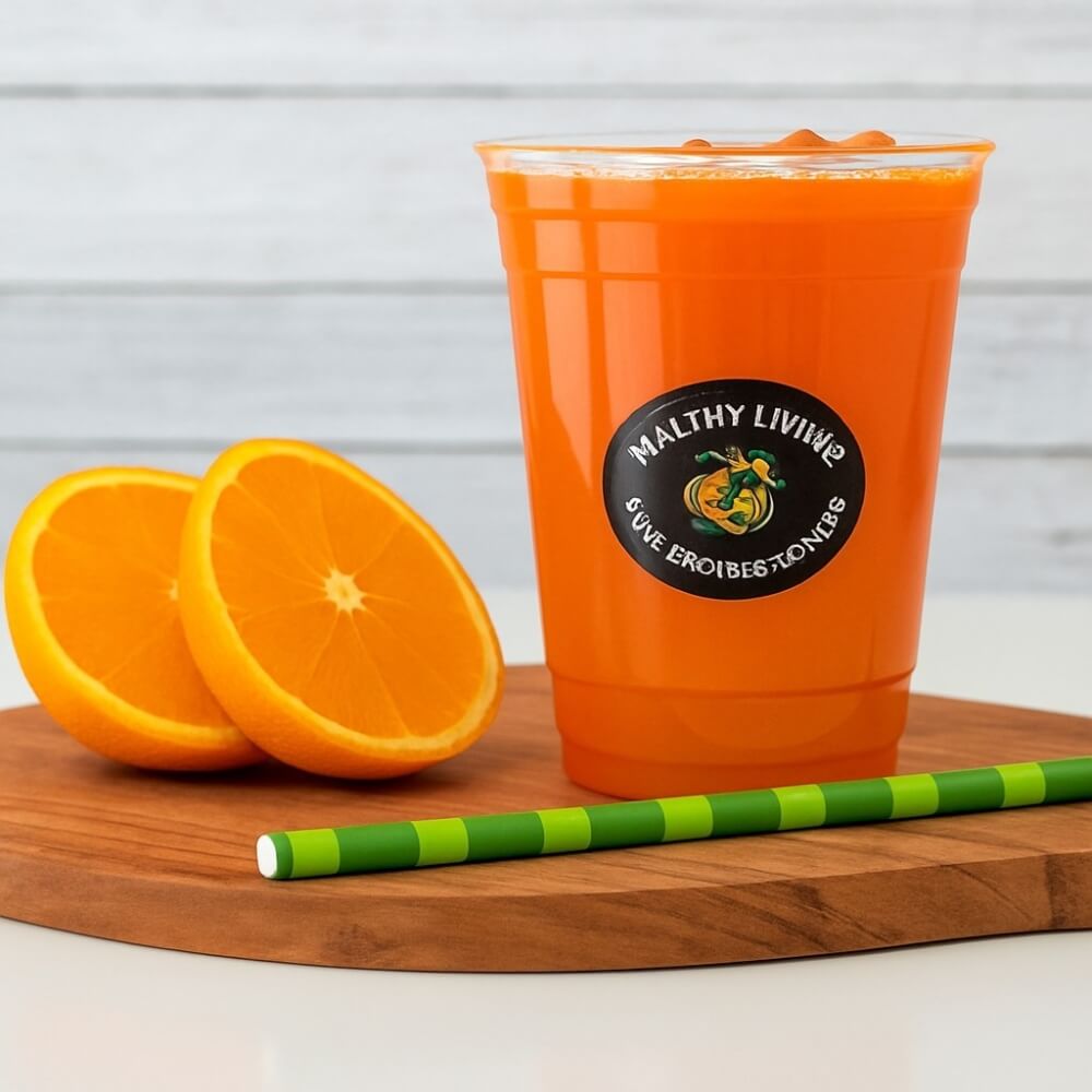 A vibrant, immune-boosting blend of orange, lemon, ginger, turmeric, and spirulina — bursting with antioxidants and natural energy for a refreshing wellness kick.