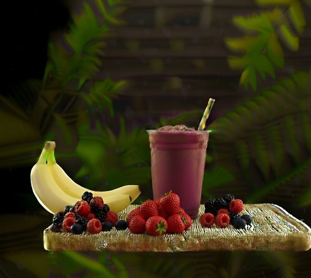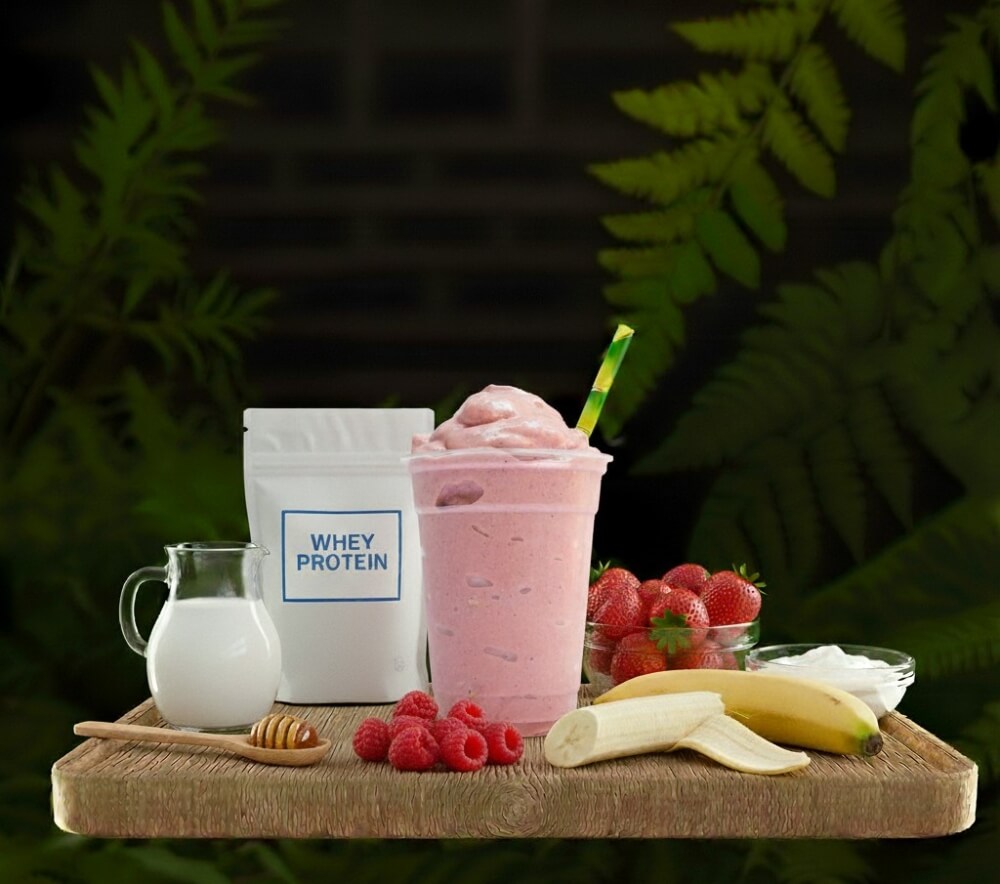 Milk, Banana, Strawberries, Raspberries, Yoghurt, Honey, Whey Protein