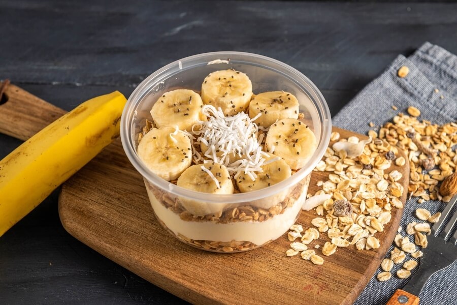 Banana Muesli Yogurt – a fibre-rich, probiotic boost that fuels energy and supports digestion sprinked with Coconut Flakes and Chia seeds