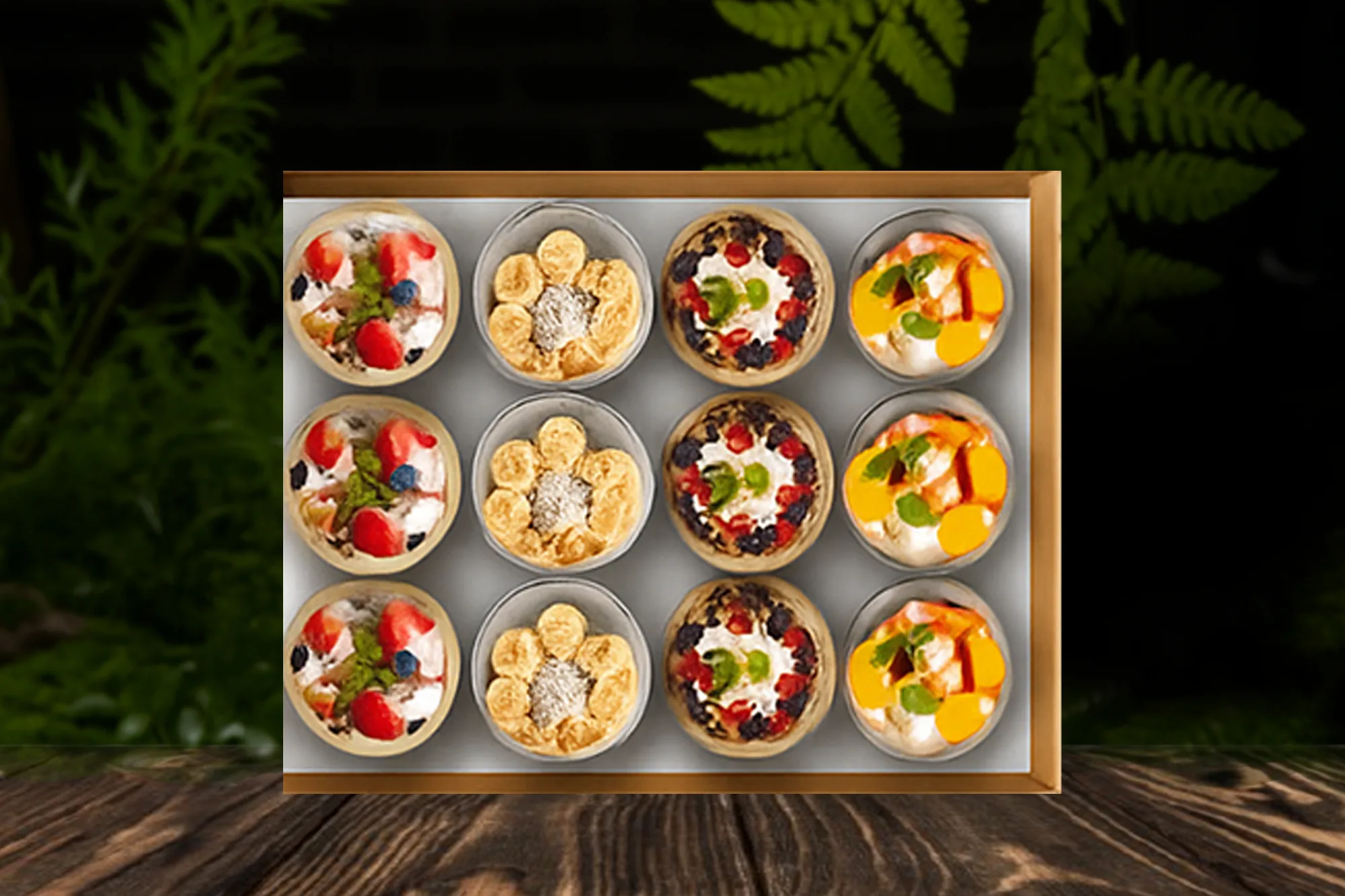12 Creamy yoghurt cups topped with Granola to choose from Berry Chia, Strawberry, Mango, Nutty, Raspberry, Passion Fruit , Apple, Toasted Muesli