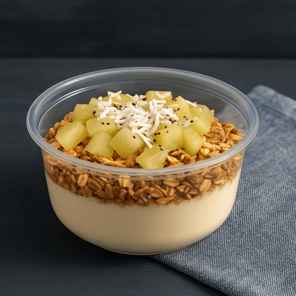 Refreshing mix of strawberry and kiwi with creamy yogurt, oats, and coconut flakes that supports digestion and delivers lasting energy