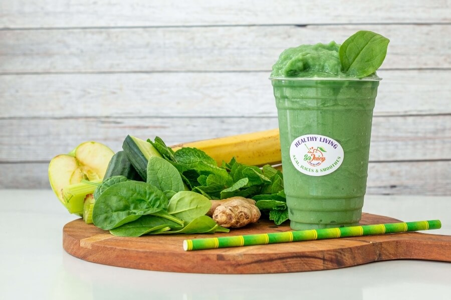 Apple, Spinach, Cucumber, Celery, Lemon/Lime, Ginger, Banana, Yoghurt, Spirulina & Chia Seeds